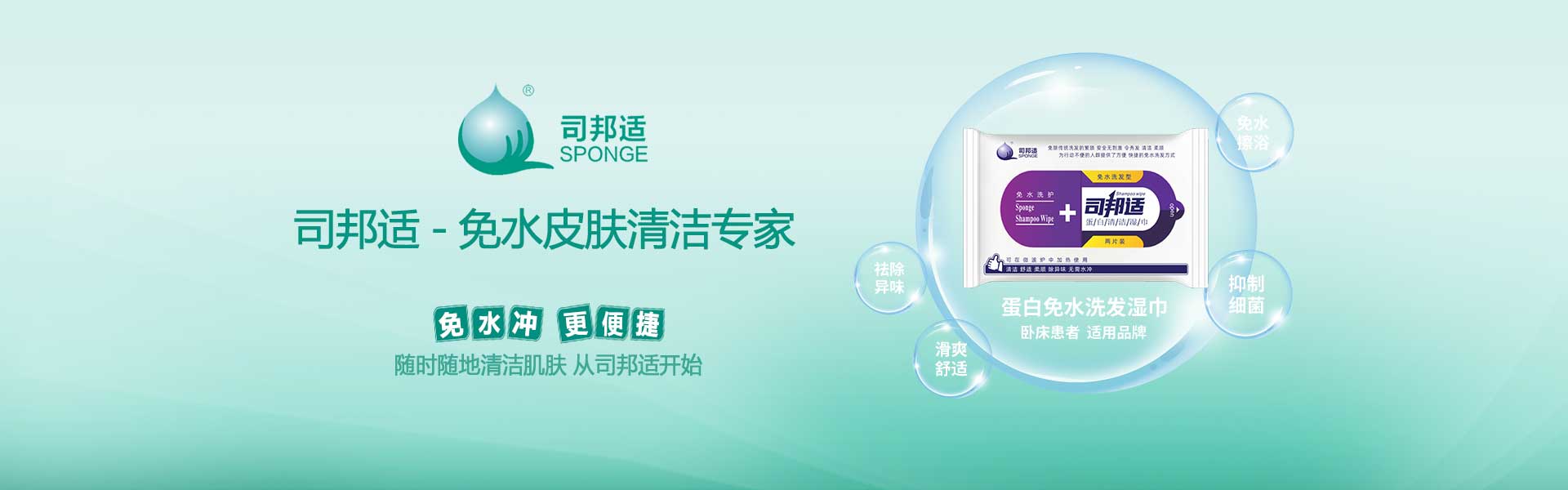 ? ? ? ?本公司研發的司邦適蛋白表面活性因子,不僅對人體皮膚及粘膜沒有刺激,同時具有對皮膚很強的清潔能力;可以祛除人體皮膚上的異味,并且具有較強的抑菌功效。使用后無需用水沖洗皮膚仍感到舒適爽滑;基于上述原因我們研發的司邦適免水清潔系列產品。主要適用于各種主觀或者客觀上不方便全身或局部皮膚清潔的人群。
